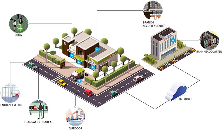 Bank is a financial institution licensed to receive deposits making loans. There are various important facilities in the bank, such as ATMs and coffers, and the bank would receive a large number of clients everday. Hence, a complete and comprehensive bank video surveillance solution should take these into consideration. It should cover all critical areas without any blind spot and realize unified management at headquarters.